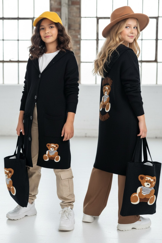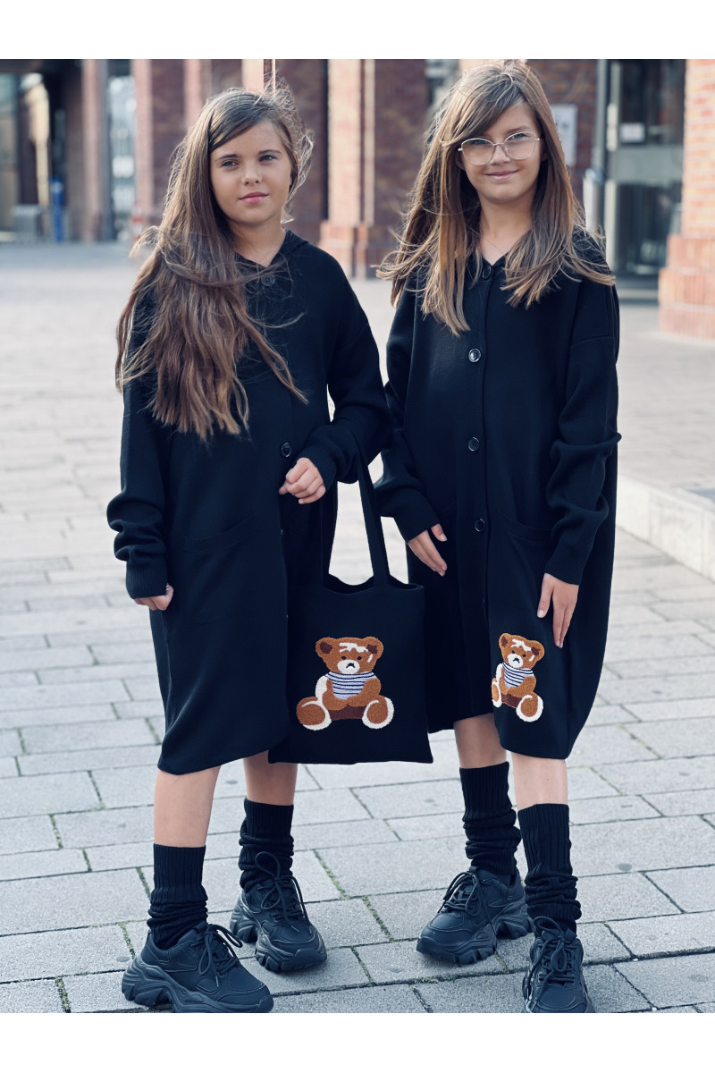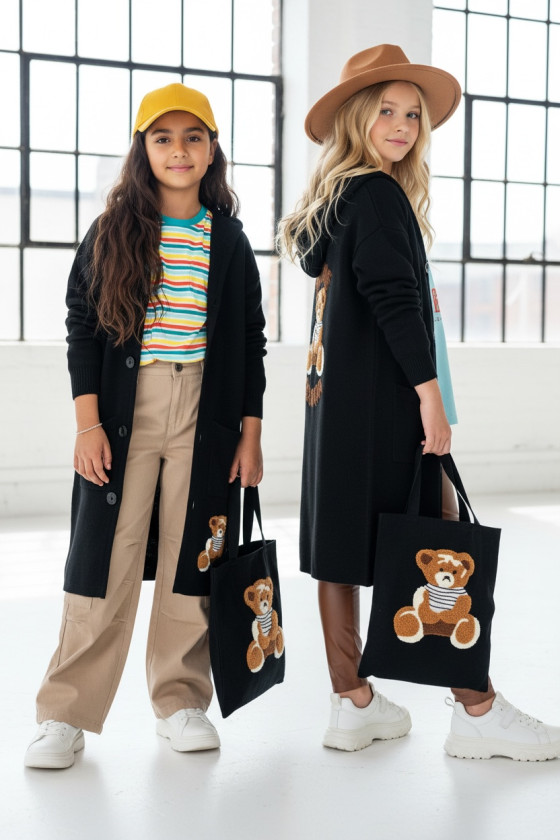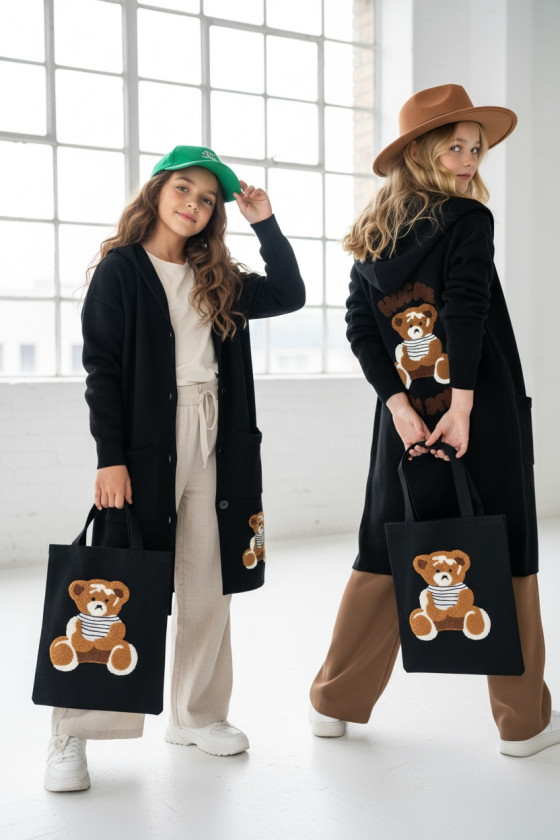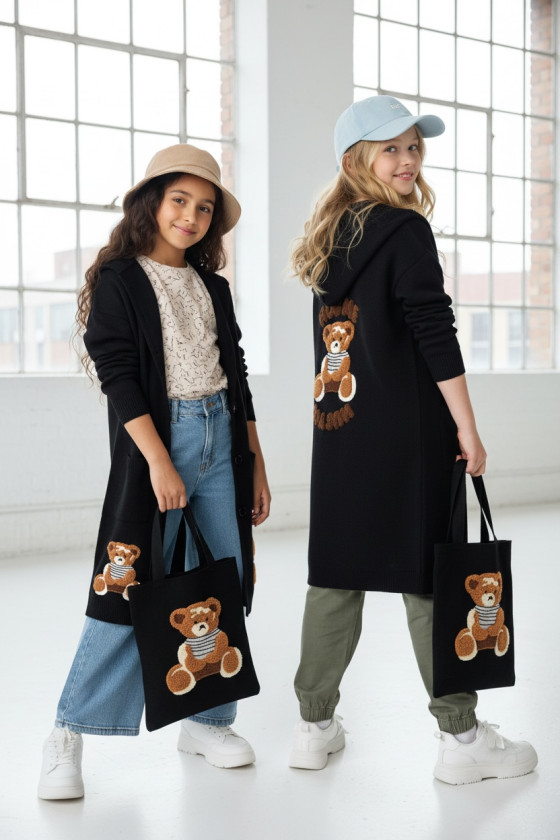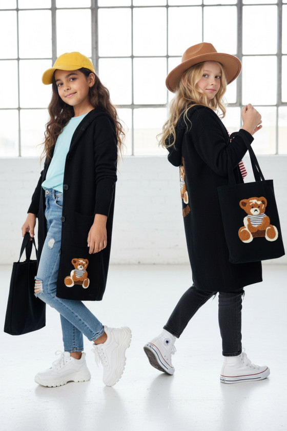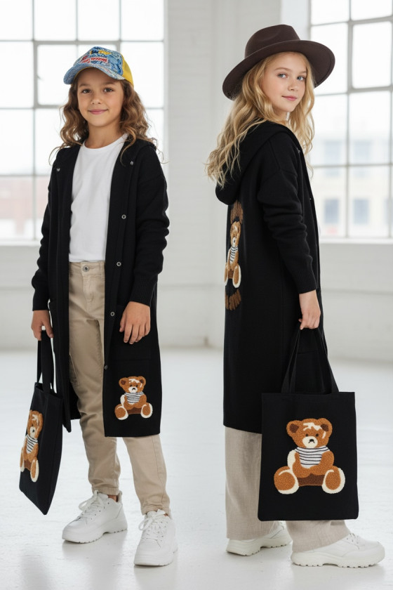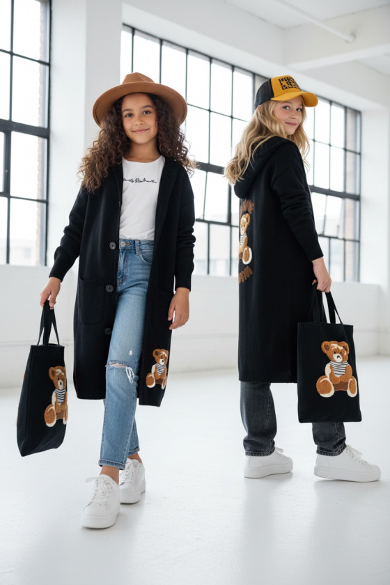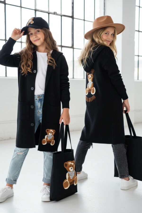 Stylowy i ciepły kardigan dla dziewczynki idealny na chłodniejsze dni, zapewnia wygodę i swobodę ruchu. Kardigan z lużnym kapturem, zapinany na guziki, finkcionalne kieszenie. Kardigan wyróżnia się urokliwym haftowanym wizerunkiem misia, z przodu mały miś, na plecach miś z napisem Hug Me, co dodaje mu uroku i oryginalności. Wykonany z wysokiej jakości materiałów gwarantuje trwałość i komfort użytkowania, doskonały wybór na codzienne wyjścia do szkoły lub na rodzinne spacery. Połączenie dziewczęcego stylu i praktyczności, sprawia, że kardigan stanie się ulubionym elementem garderoby twojego dziecka. Kardigan może pełnić funkcję sukienki co czyni go wszechstronnym elementem garderoby, pasuje do wielu różnych stylizacj,i zarówno casualowych jak i bardziej eleganckich. W komplecie idealnie pasująca torebkę shoperkę z takim samym haftowanym misiem.