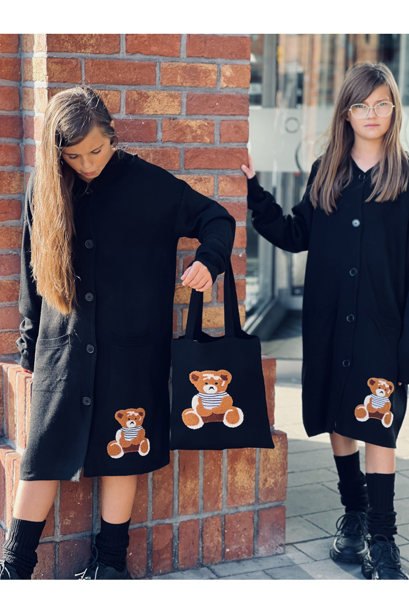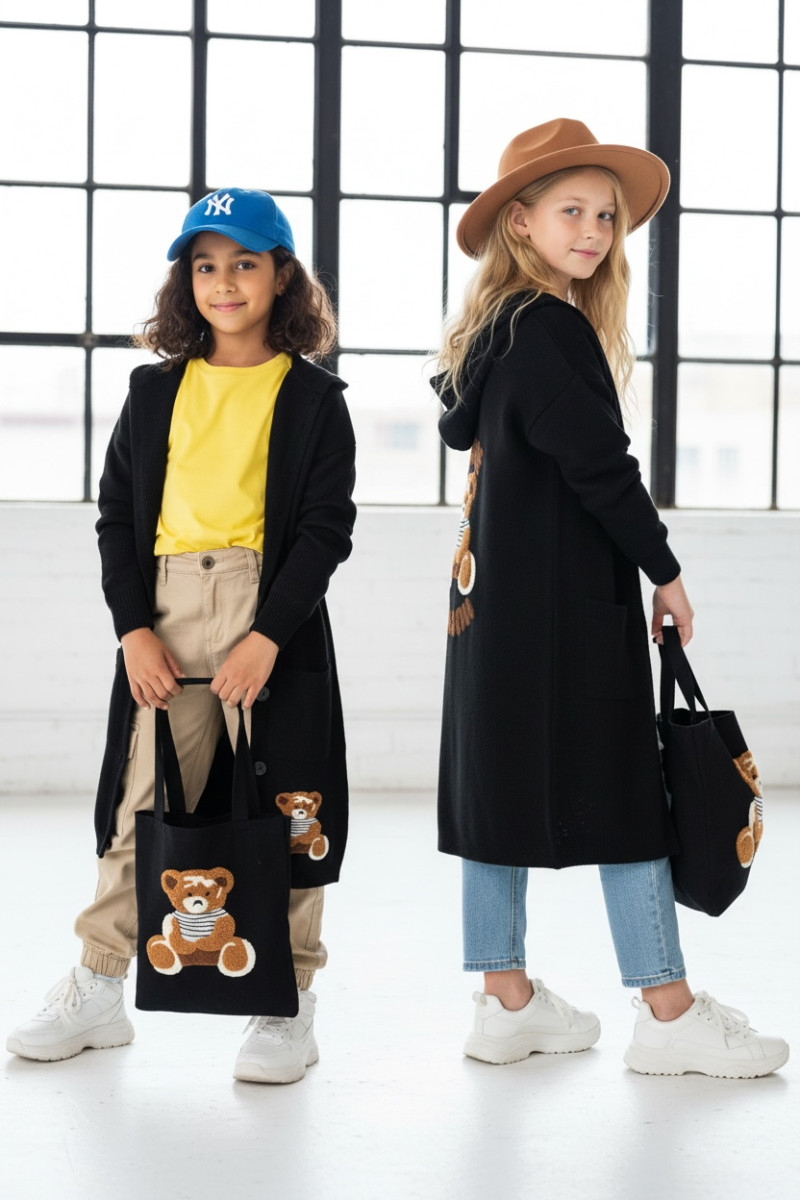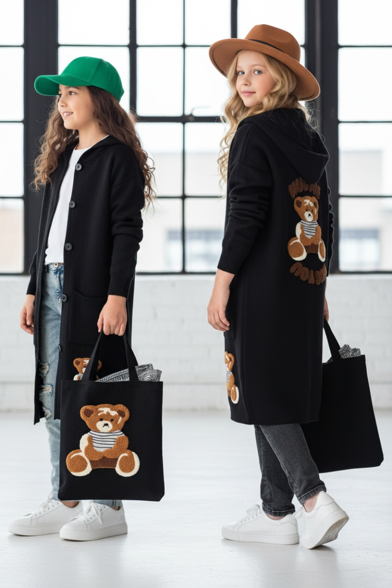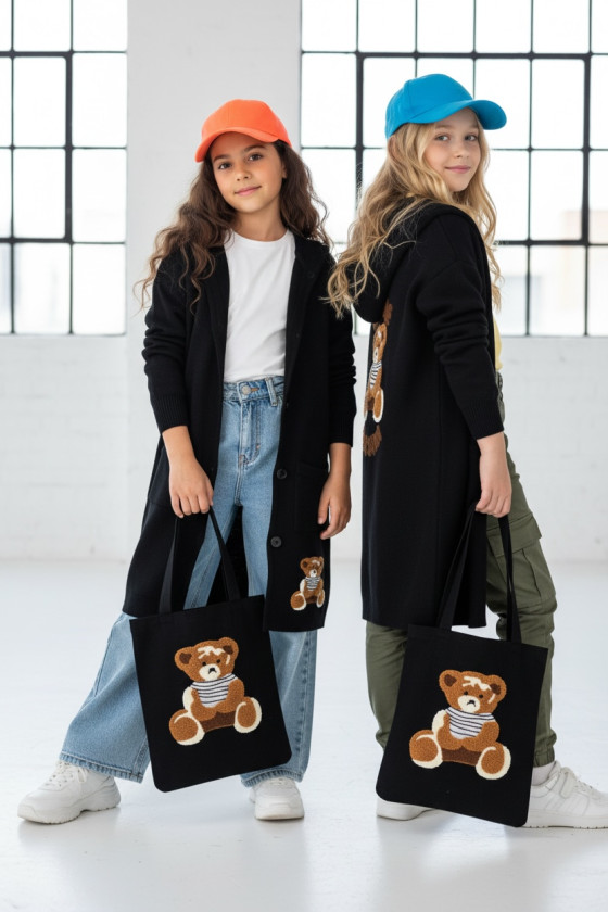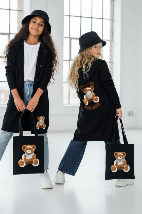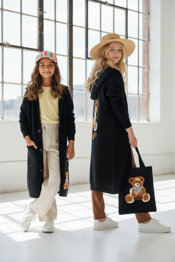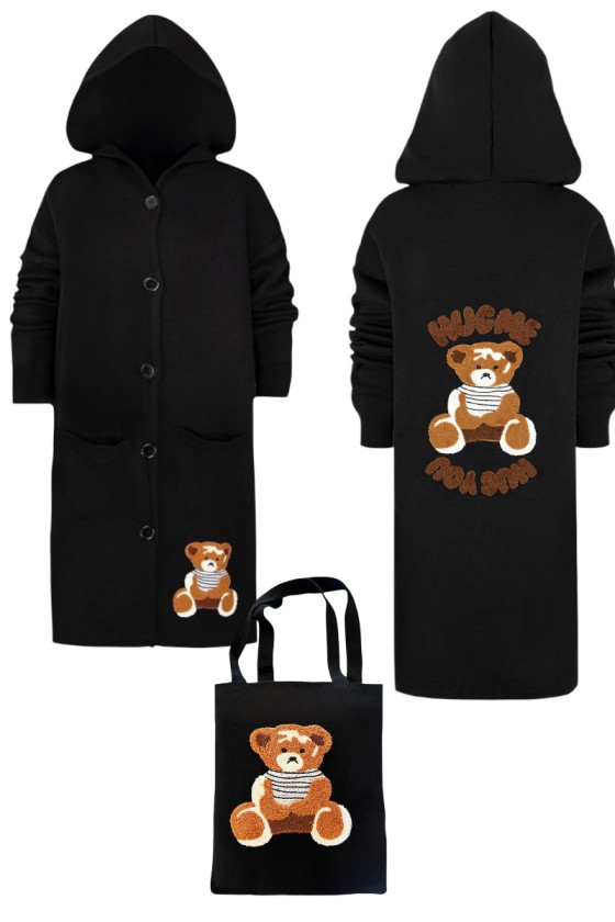 Stylowy i ciepły kardigan dla dziewczynki idealny na chłodniejsze dni, zapewnia wygodę i swobodę ruchu. Kardigan z lużnym kapturem, zapinany na guziki, finkcionalne kieszenie. Kardigan wyróżnia się urokliwym haftowanym wizerunkiem misia, z przodu mały miś, na plecach miś z napisem Hug Me, co dodaje mu uroku i oryginalności. Wykonany z wysokiej jakości materiałów gwarantuje trwałość i komfort użytkowania, doskonały wybór na codzienne wyjścia do szkoły lub na rodzinne spacery. Połączenie dziewczęcego stylu i praktyczności, sprawia, że kardigan stanie się ulubionym elementem garderoby twojego dziecka. Kardigan może pełnić funkcję sukienki co czyni go wszechstronnym elementem garderoby, pasuje do wielu różnych stylizacj,i zarówno casualowych jak i bardziej eleganckich. W komplecie idealnie pasująca torebkę shoperkę z takim samym haftowanym misiem.