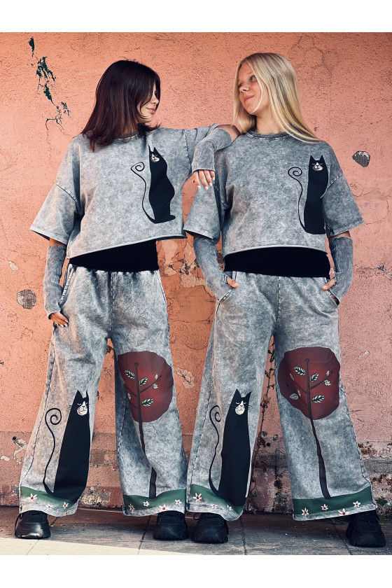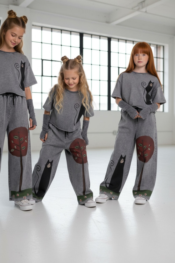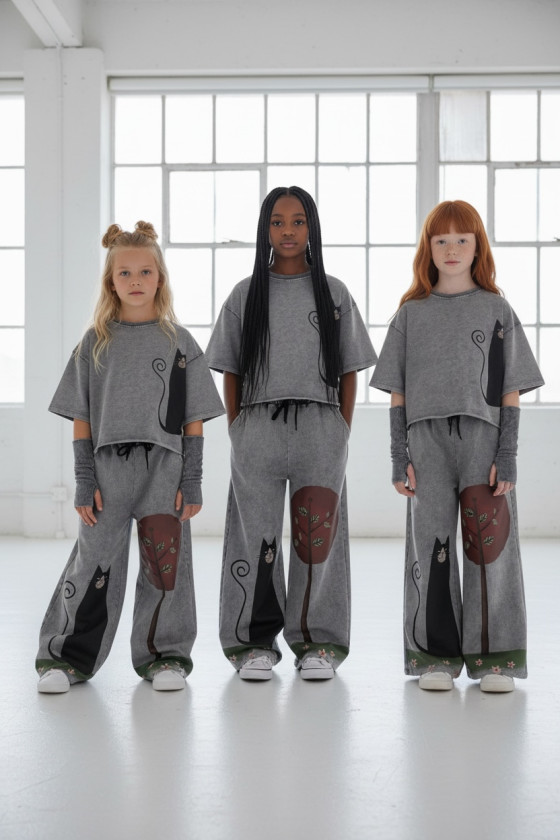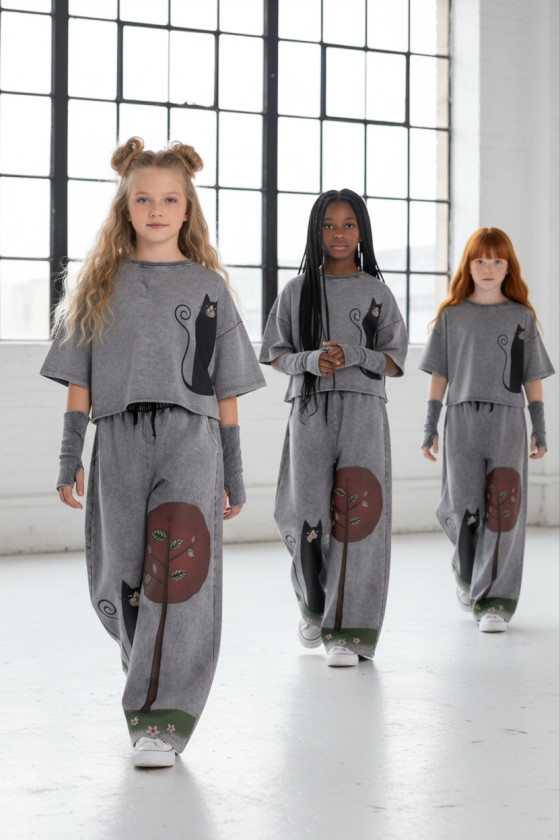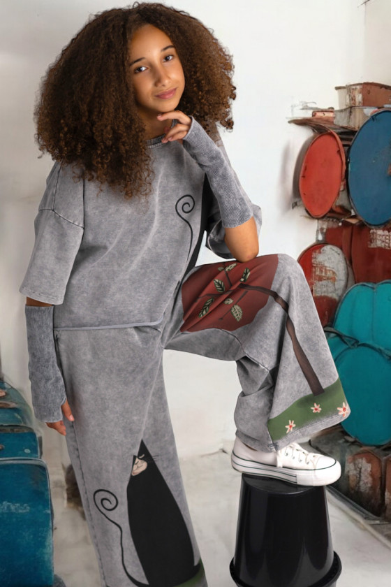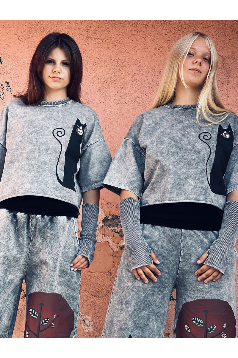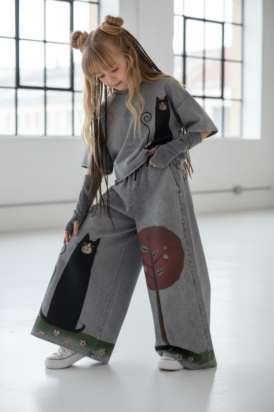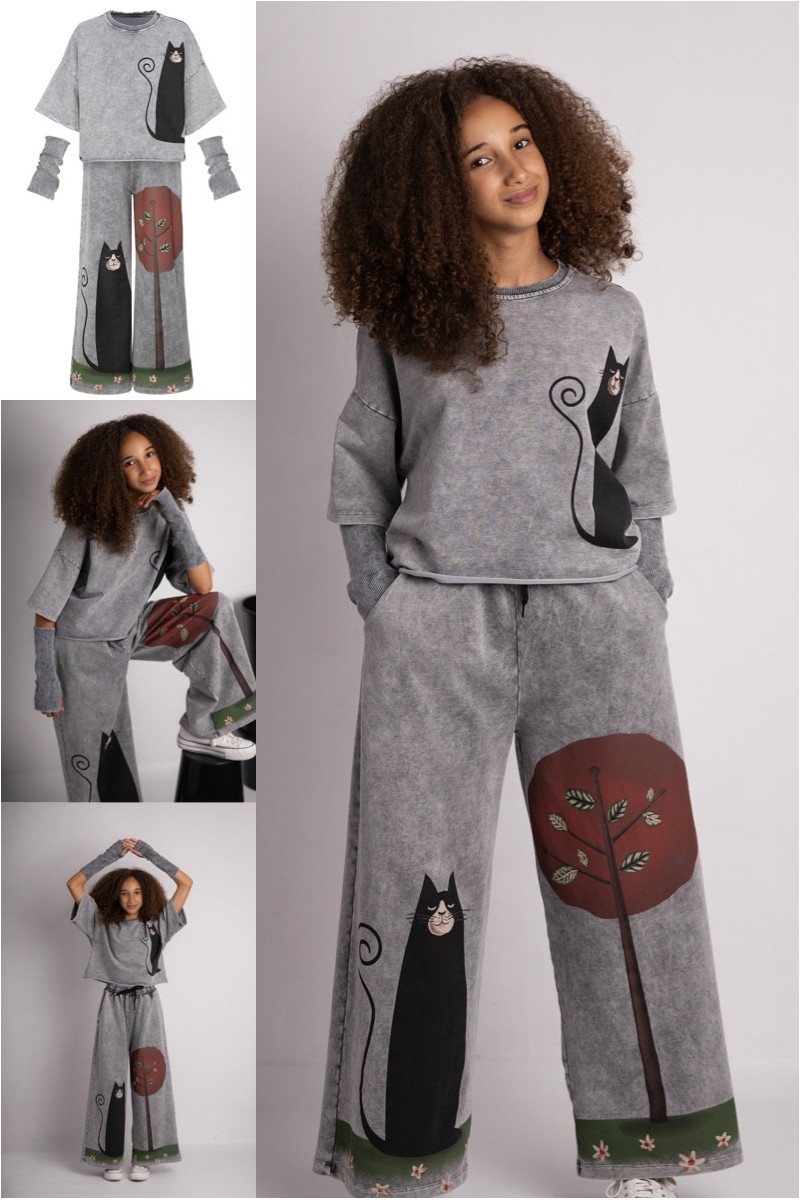 3-częściowy komplet dziewczęcy “Magic Cat” w skład, którego wchodzi bluzka i spodnie w stylu oversize oraz mitenki-rękawy. Rozmiary od 128 do 164
