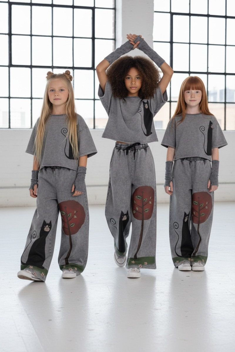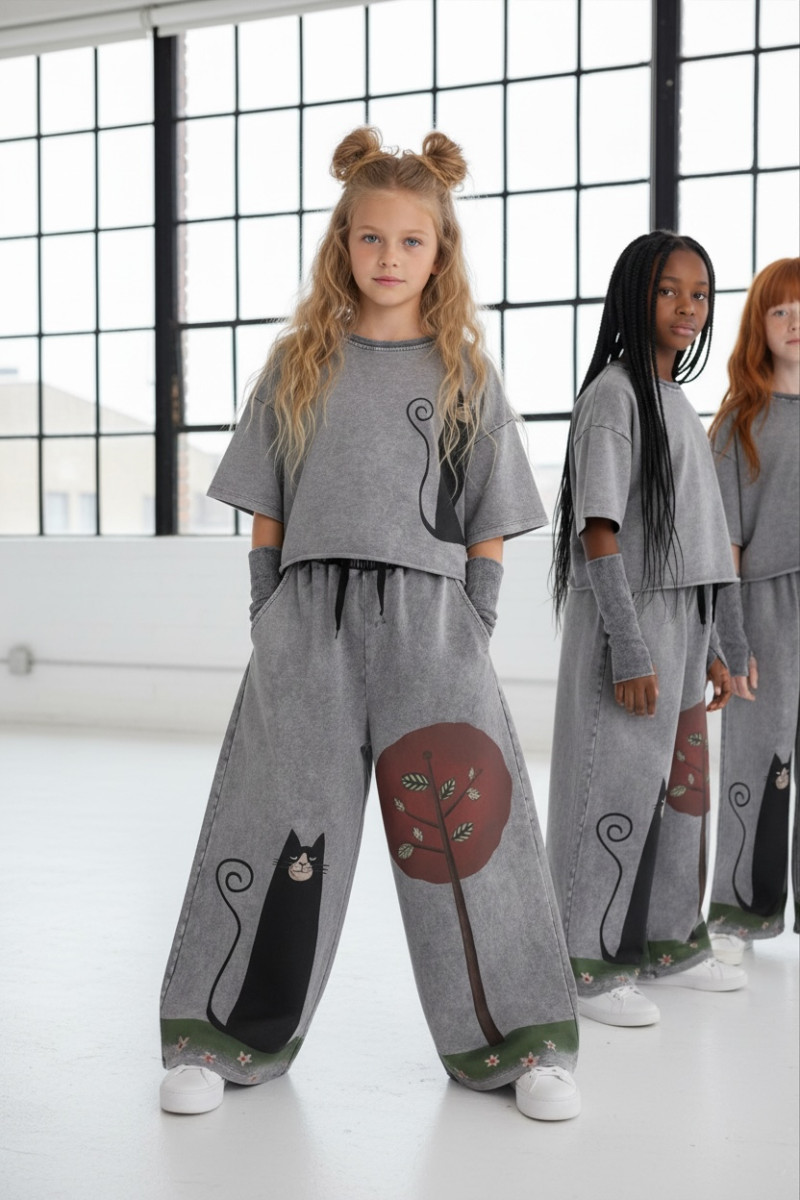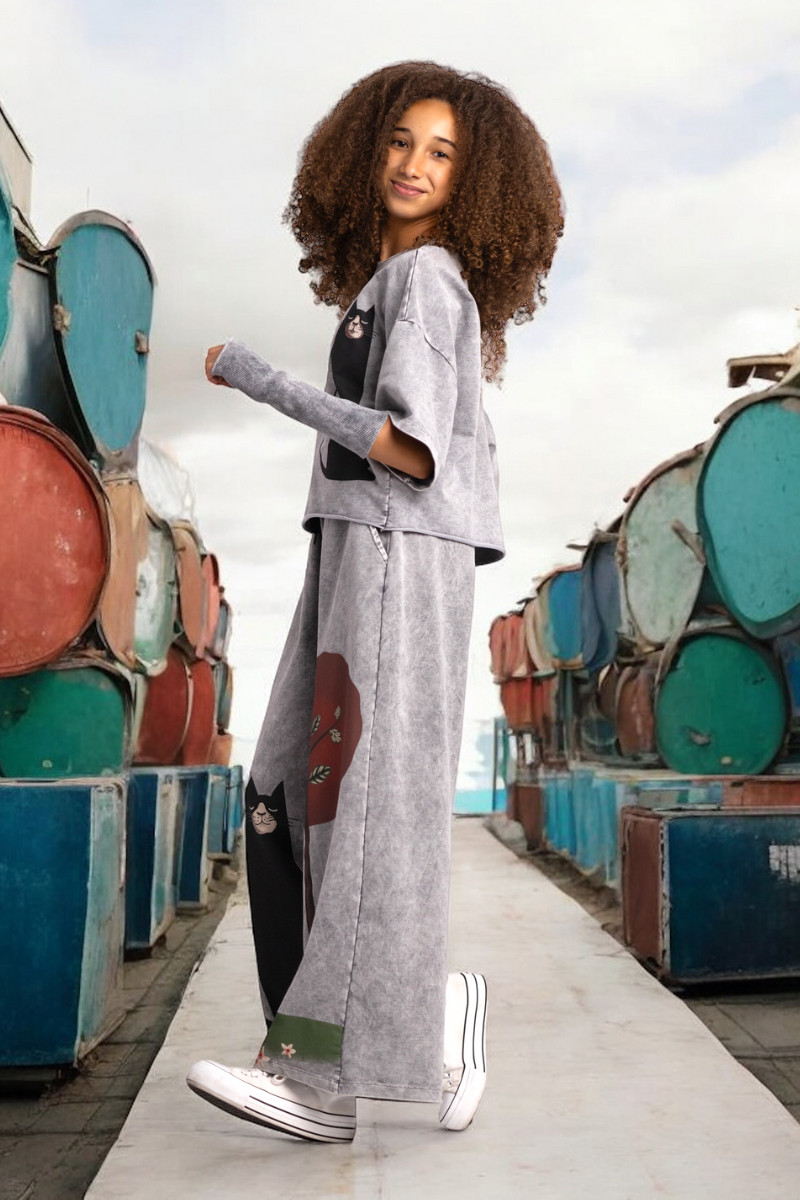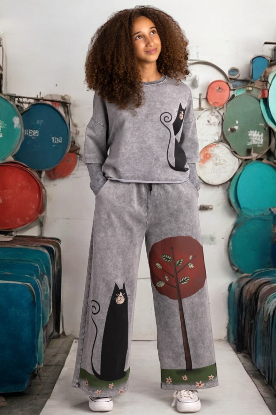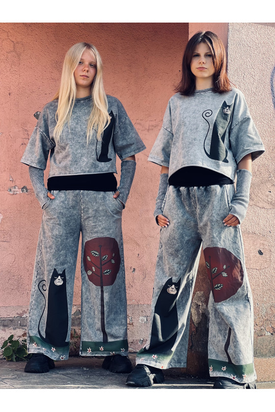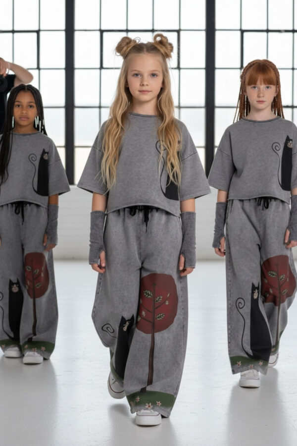 3-częściowy komplet dziewczęcy “Magic Cat” w skład, którego wchodzi bluzka i spodnie w stylu oversize oraz mitenki-rękawy. Rozmiary od 128 do 164