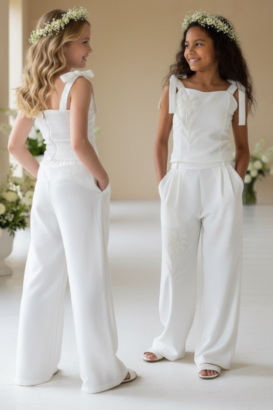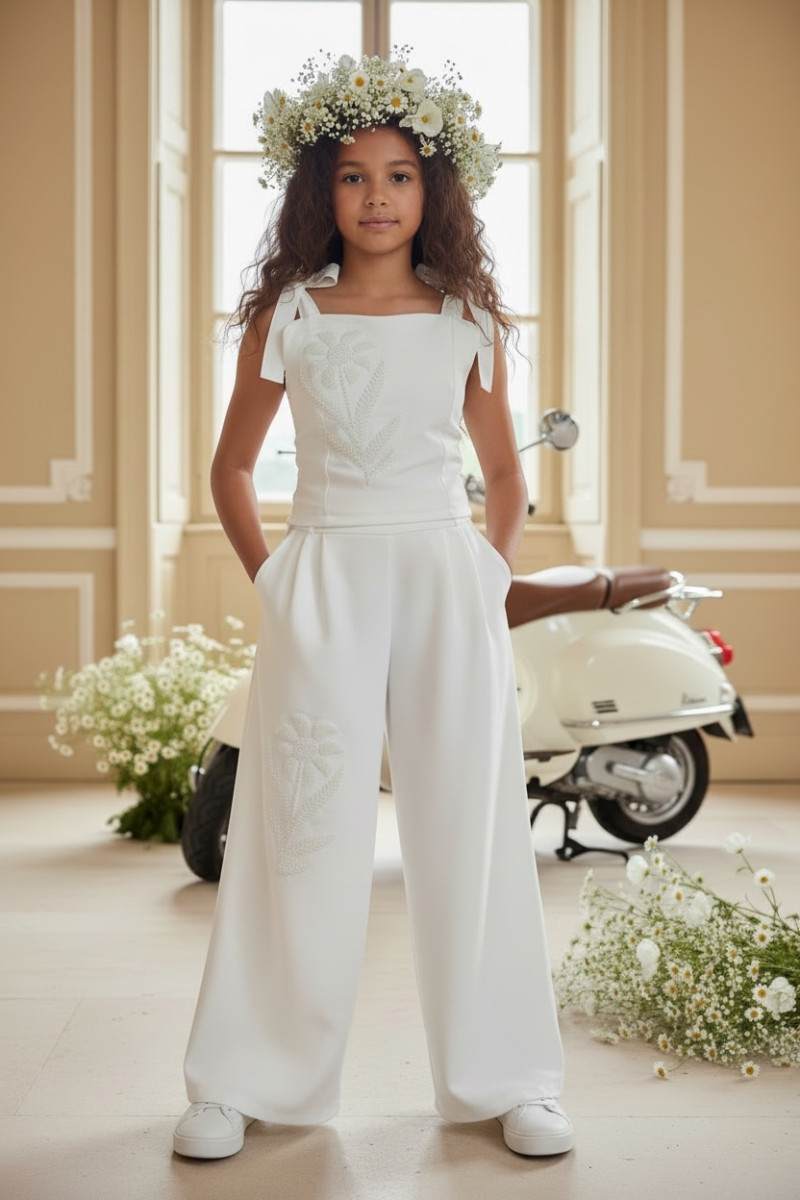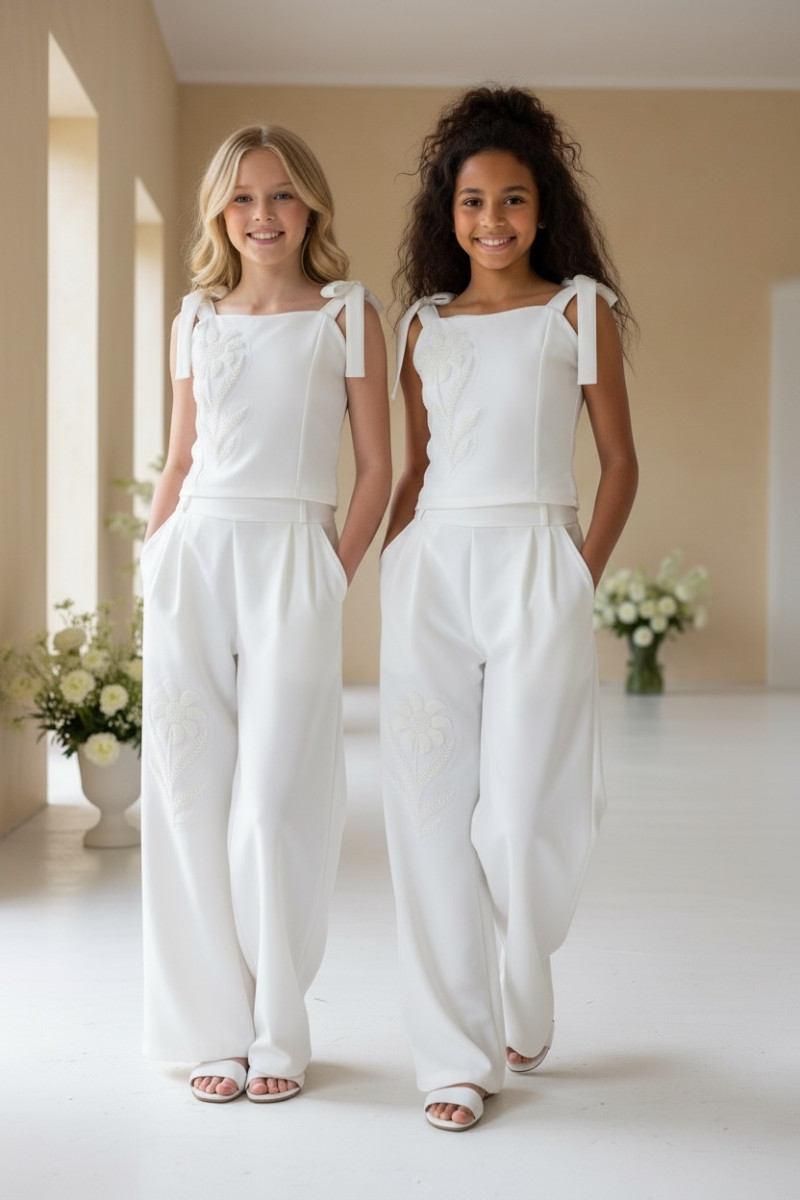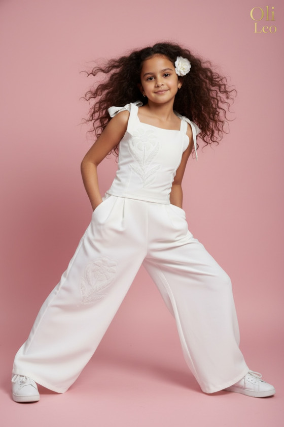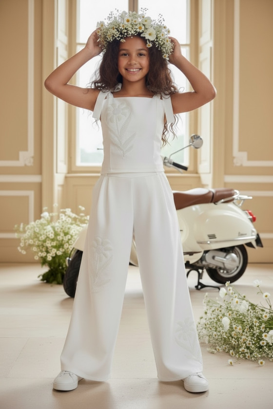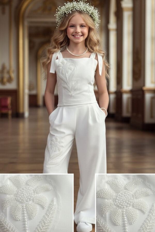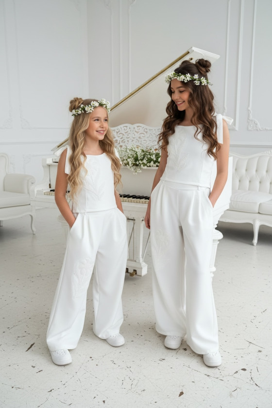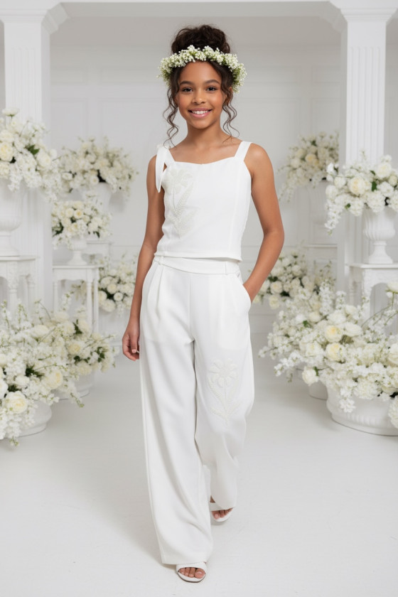Wyjątkowy zestaw w śmietankowej bieli, który zachwyca jakością wykonania . Śliczne aplikacje kwiatów na bluzce i jednej nogawce spodni tworzą subtelny odświętny efekt. Koraliki i perełki są starannie naszyte, każdy detal dopracowany by komplet pięknie prezentował podczas wyjątkowych uroczystości.
