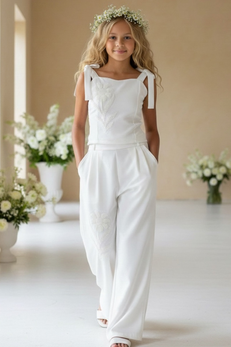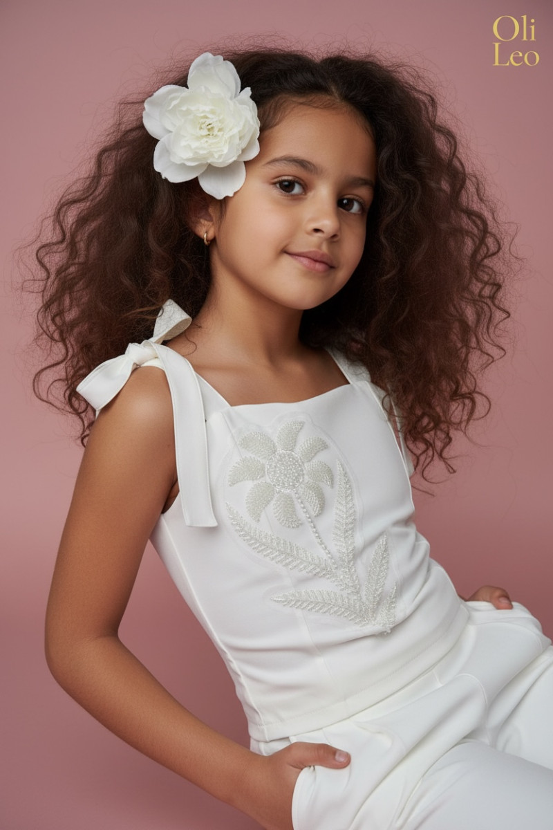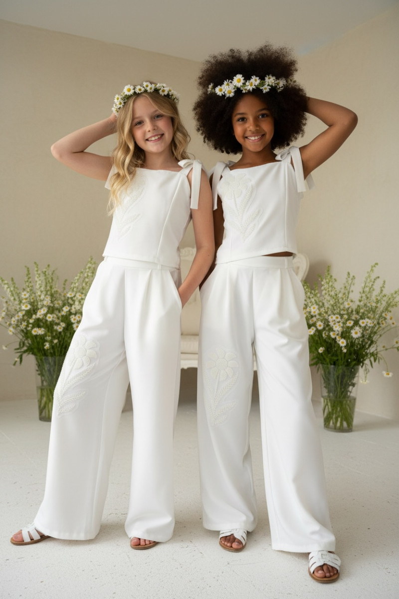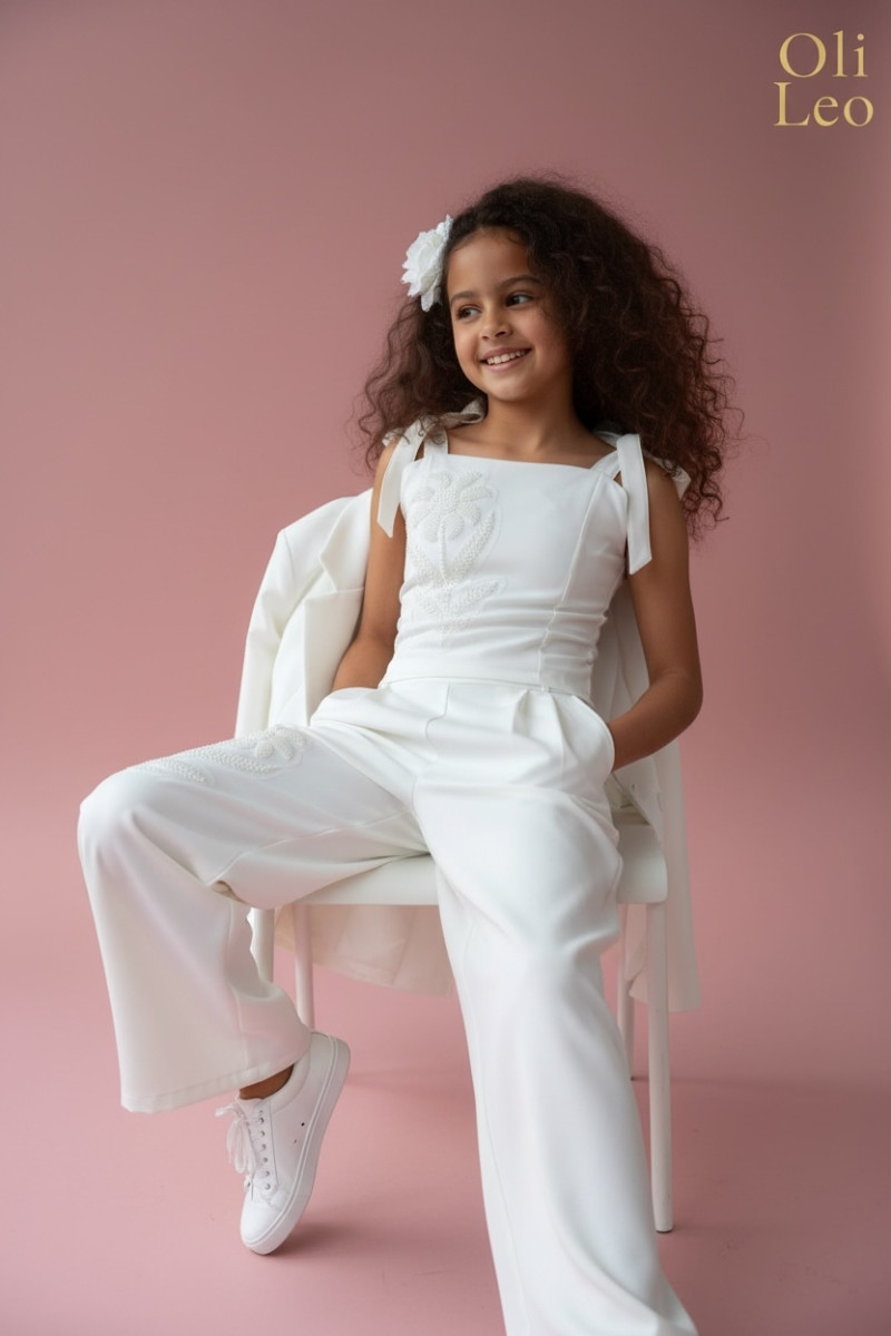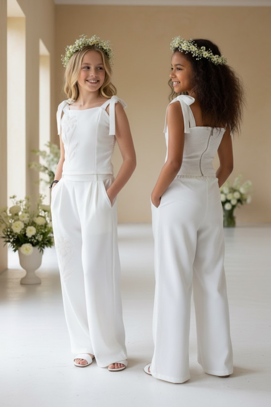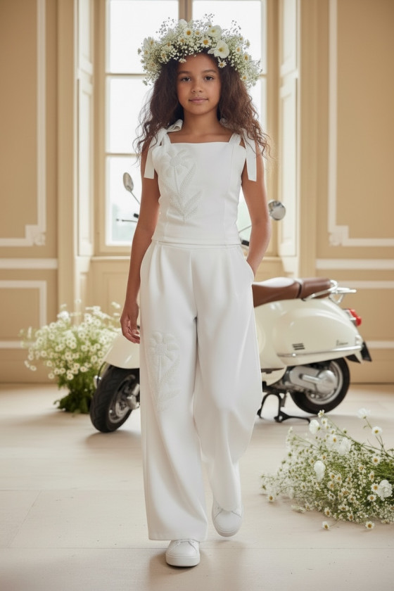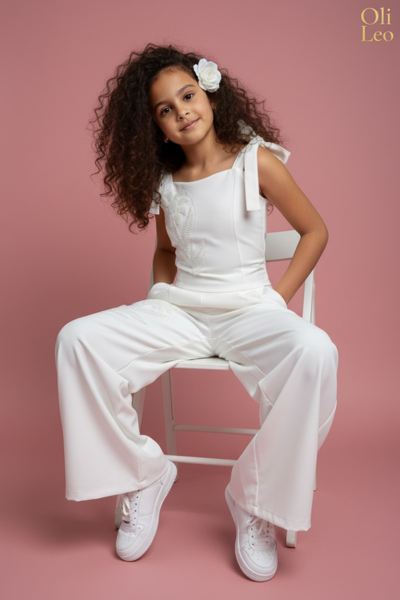 Wyjątkowy zestaw w śmietankowej bieli, który zachwyca jakością wykonania . Śliczne aplikacje kwiatów na bluzce i jednej nogawce spodni tworzą subtelny odświętny efekt. Koraliki i perełki są starannie naszyte, każdy detal dopracowany by komplet pięknie prezentował podczas wyjątkowych uroczystości.