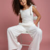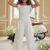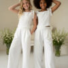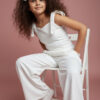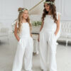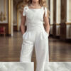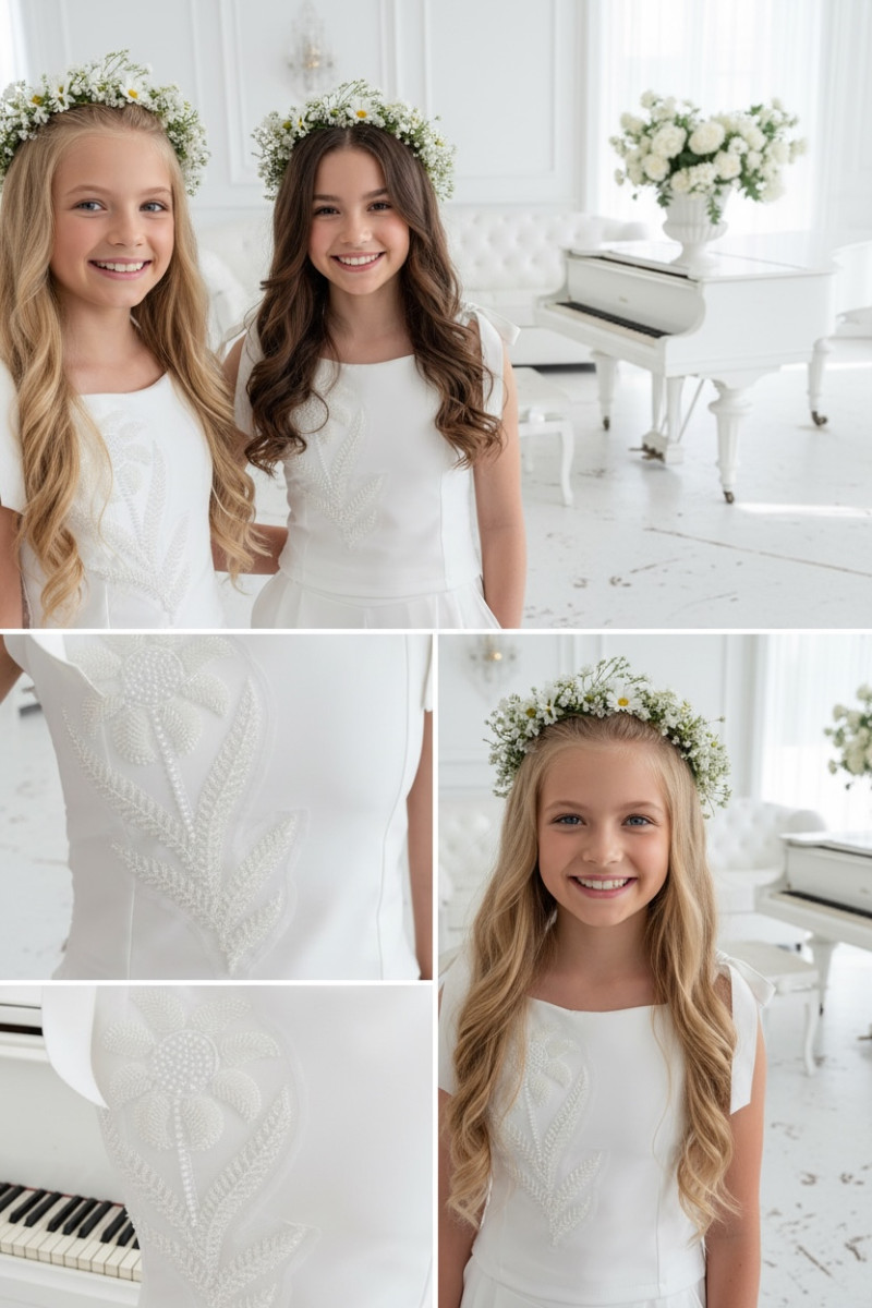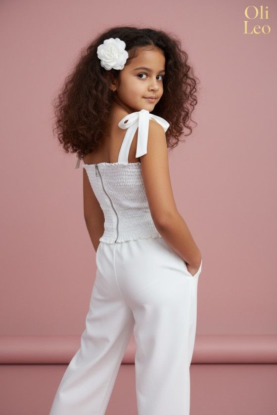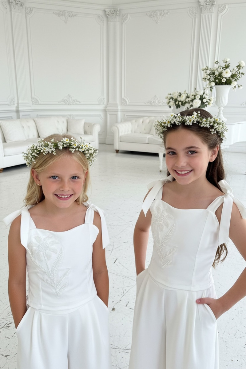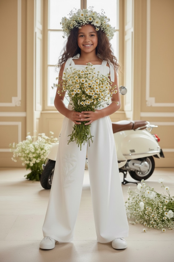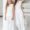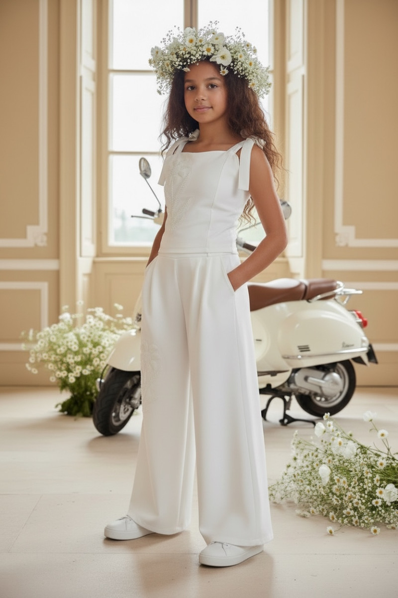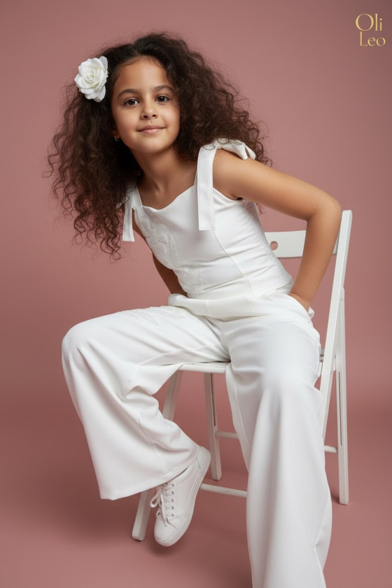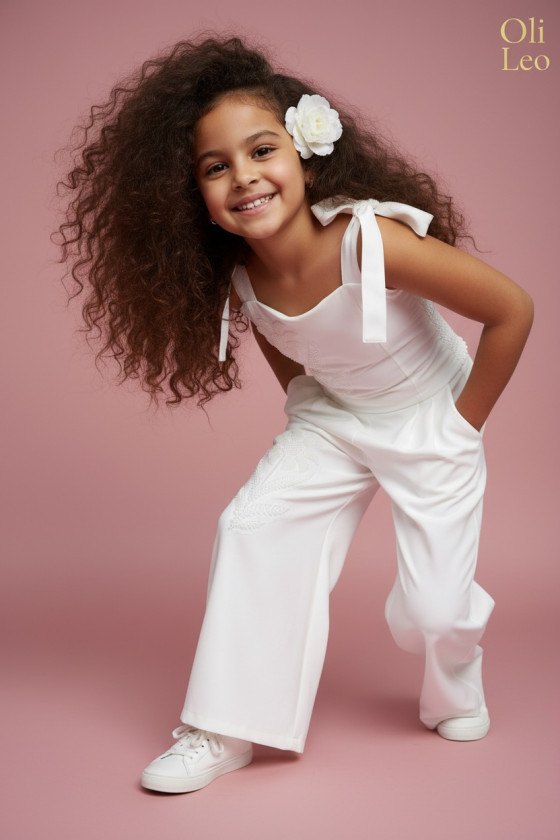 Wyjątkowy zestaw w śmietankowej bieli, który zachwyca jakością wykonania . Śliczne aplikacje kwiatów na bluzce i jednej nogawce spodni tworzą subtelny odświętny efekt. Koraliki i perełki są starannie naszyte, każdy detal dopracowany by komplet pięknie prezentował podczas wyjątkowych uroczystości.