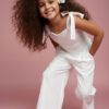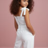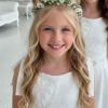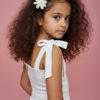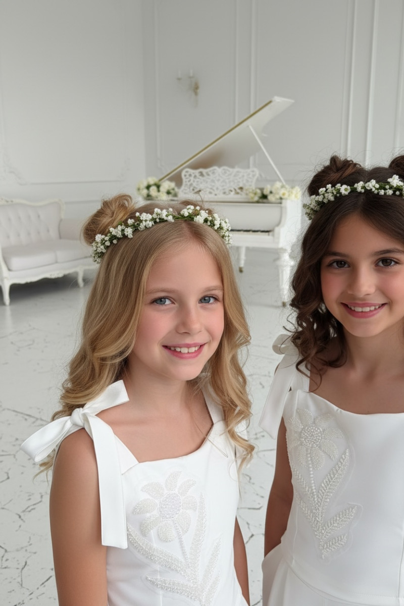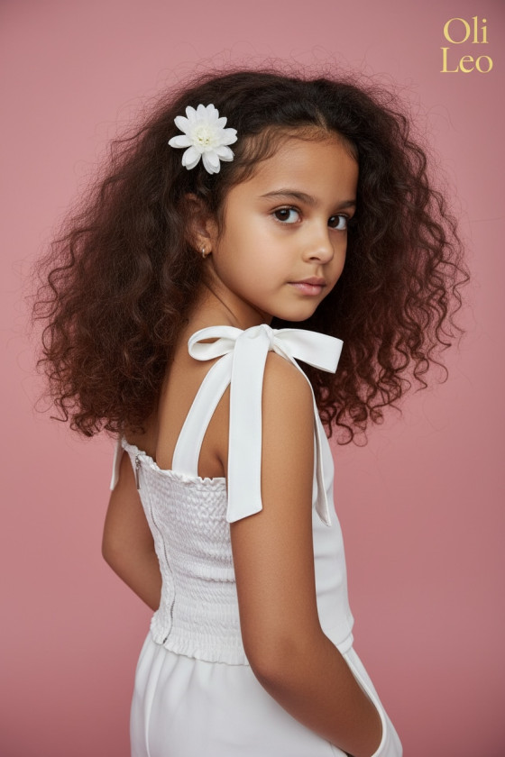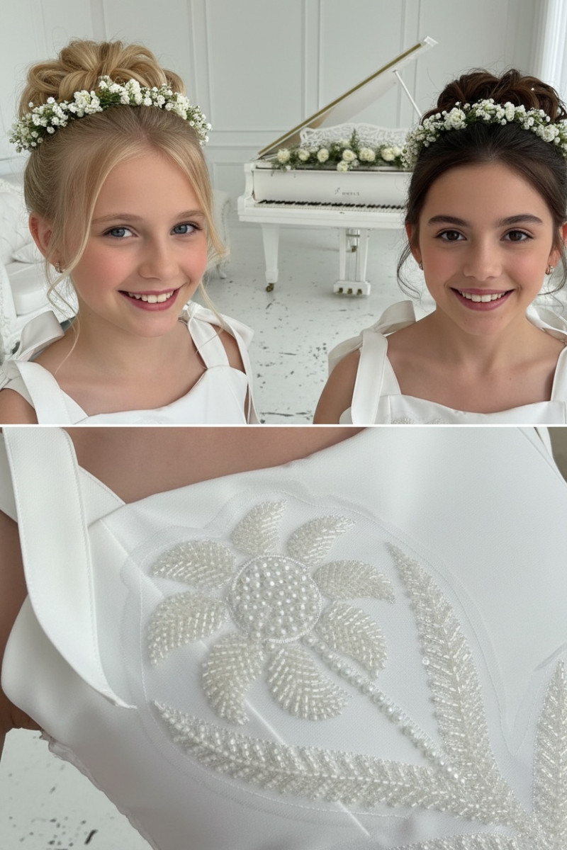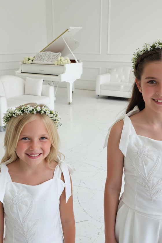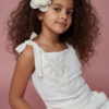 Elegancka, dopasowana wykonana z wysokiej jakości tkaniny, która pięknie trzyma fason. Tył bluzki zapinana na zamek dodatkowo gumki dla bezproblemowego dopasownia do każdej sylwetki dziecka. Ma delikatne ramiączka wiązane , dzięki czemu łatwo dopasować ją do sylwetki. Na przodzie ozdobna aplikacja kwiatowa wyszywana koralikami i perełkami, starannie wykonana, subtelna i trwała, nadająca całości odświętny charakter.