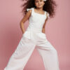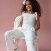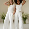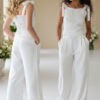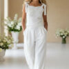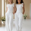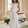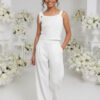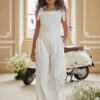 Spodnie o szerokiej, miękko układającej się nogawce, zaprojektowane z myślą o komforcie i elegancji. W tylnej części pasa gumka dla wygodnego dopasowania. Na jednej nogawce umieszczono dopasowaną aplikację kwiatową z koralikami i perełkami, która tworzy spójną stylizację z bluzką. Miękki materiał zapewnia swobodę ruchu i estetyczny wygląd podczas całej uroczystości.