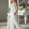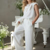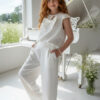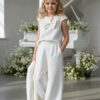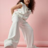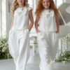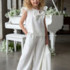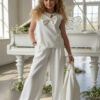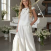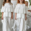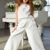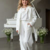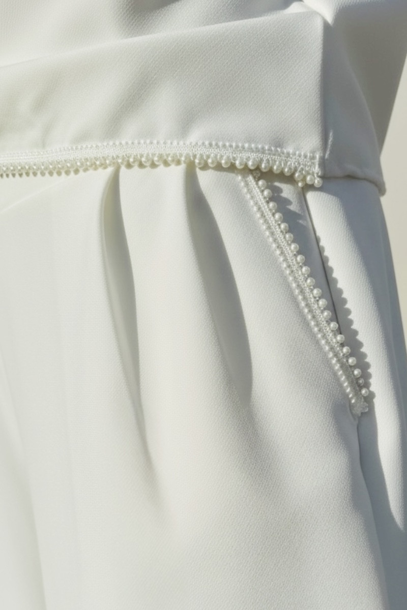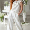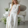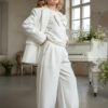 Elegancki zestaw w kolorze śmietankowej bieli, stworzony na wyjątkowe okazje. Wykonany z wysokiej jakości, gładkiej tkaniny premium, która pięknie się układa, jest przyjemna dla skóry i odporna na gniecenie. Każdy detal został dopracowany – od perełkowych wykończeń po perfekcyjne szwy.