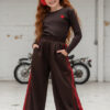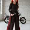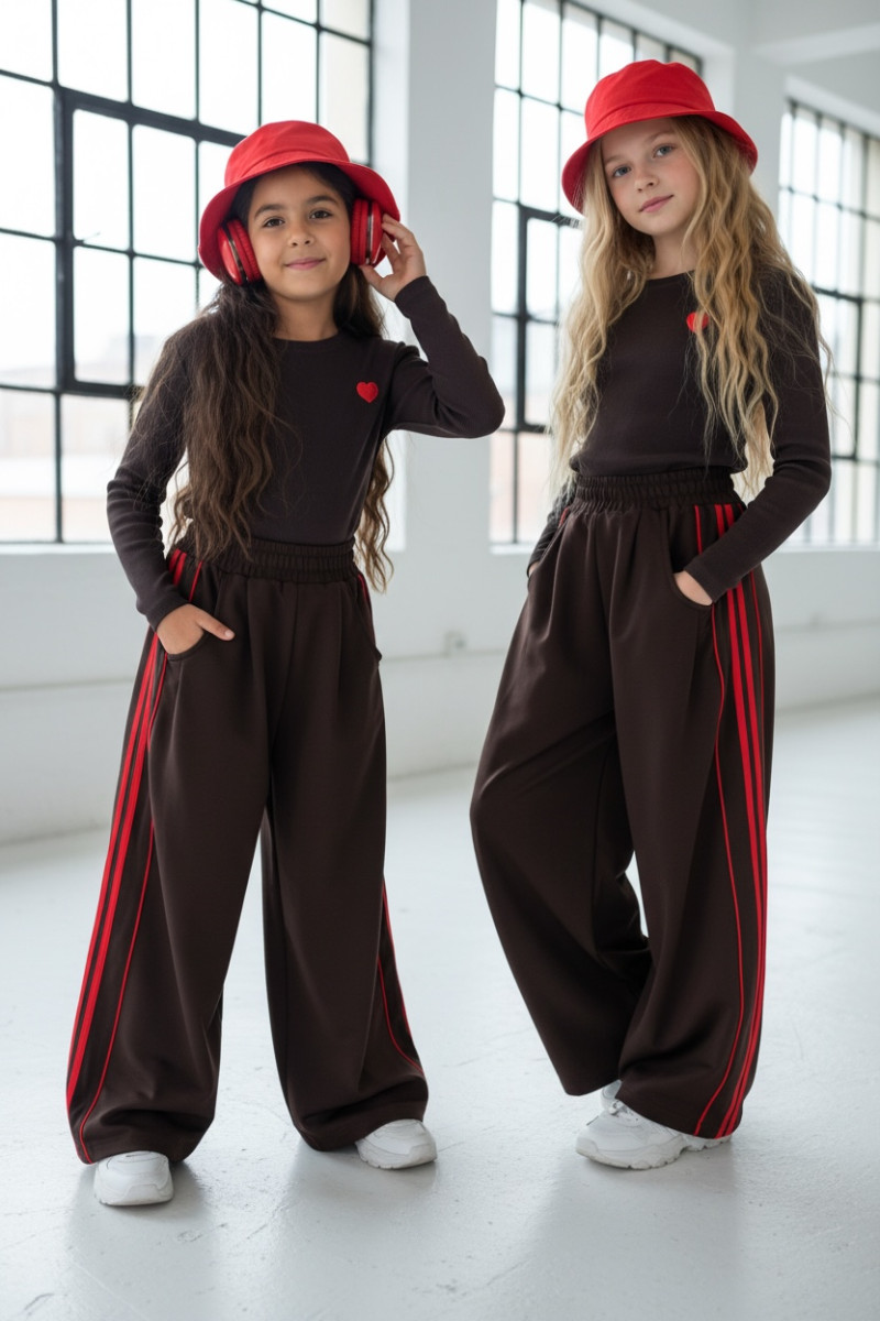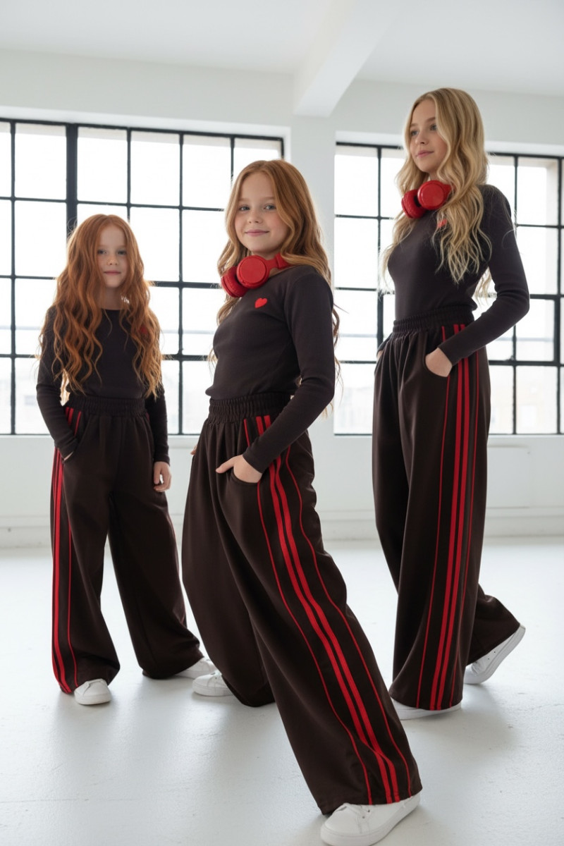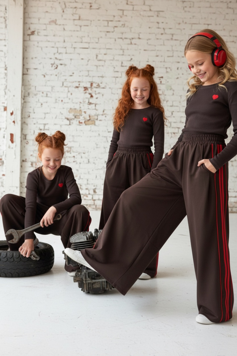 Komplet: prążkowana bluzka z haftowanym serduszkiem + spodnie z czerwonymi lampasami i stoperami w nogawce do regulacji szerokości i długości nogawek
