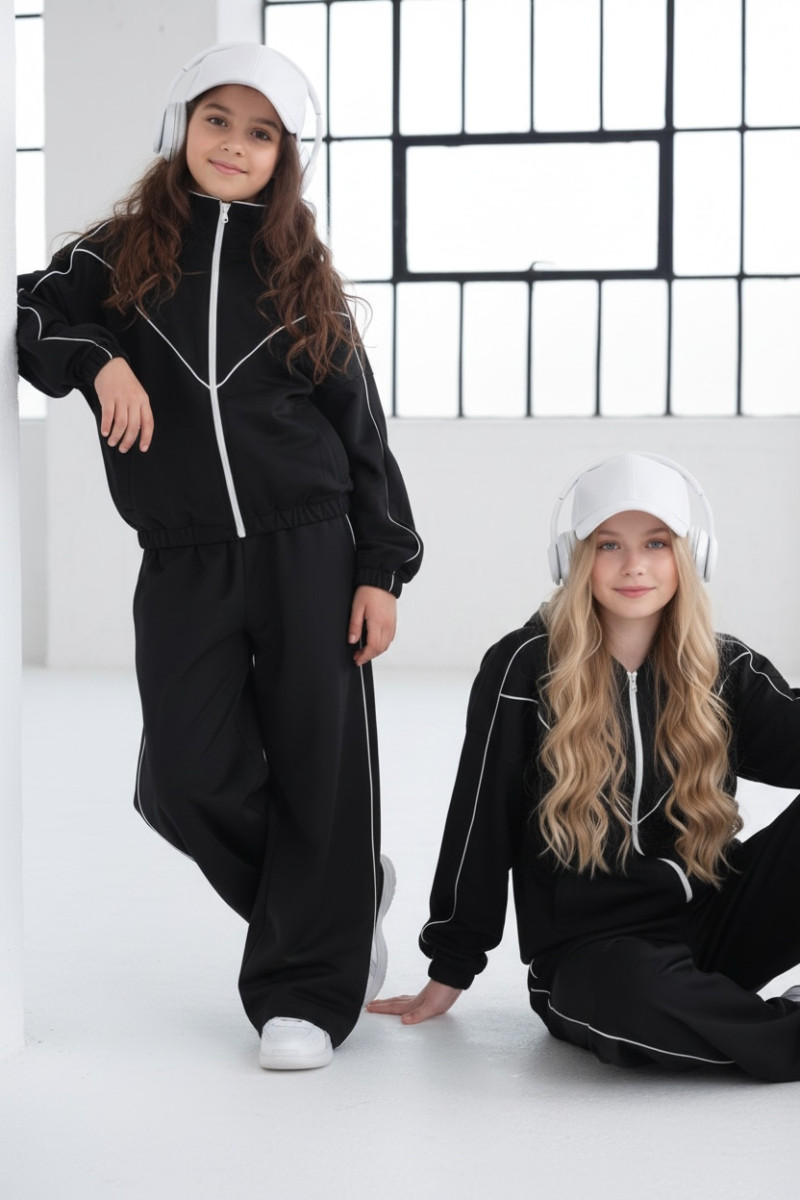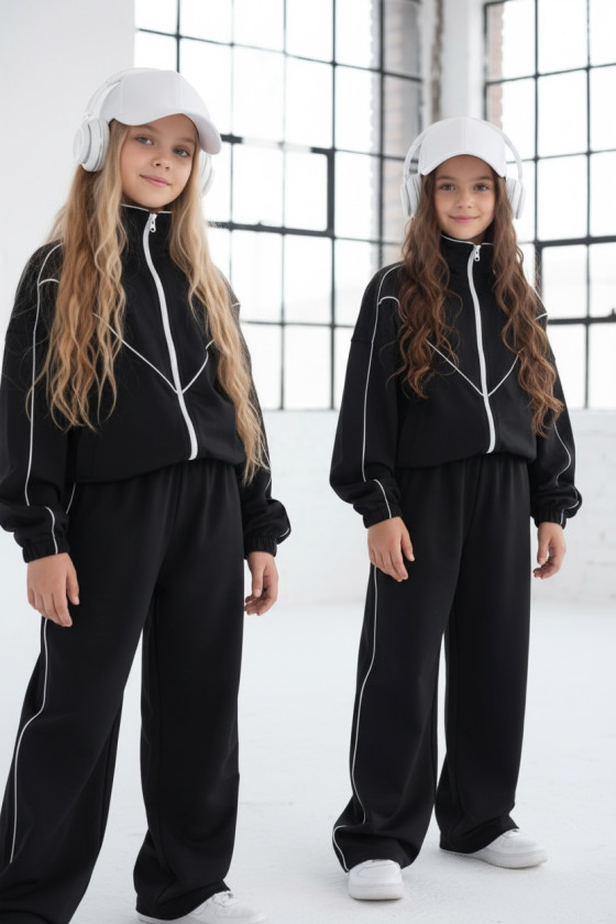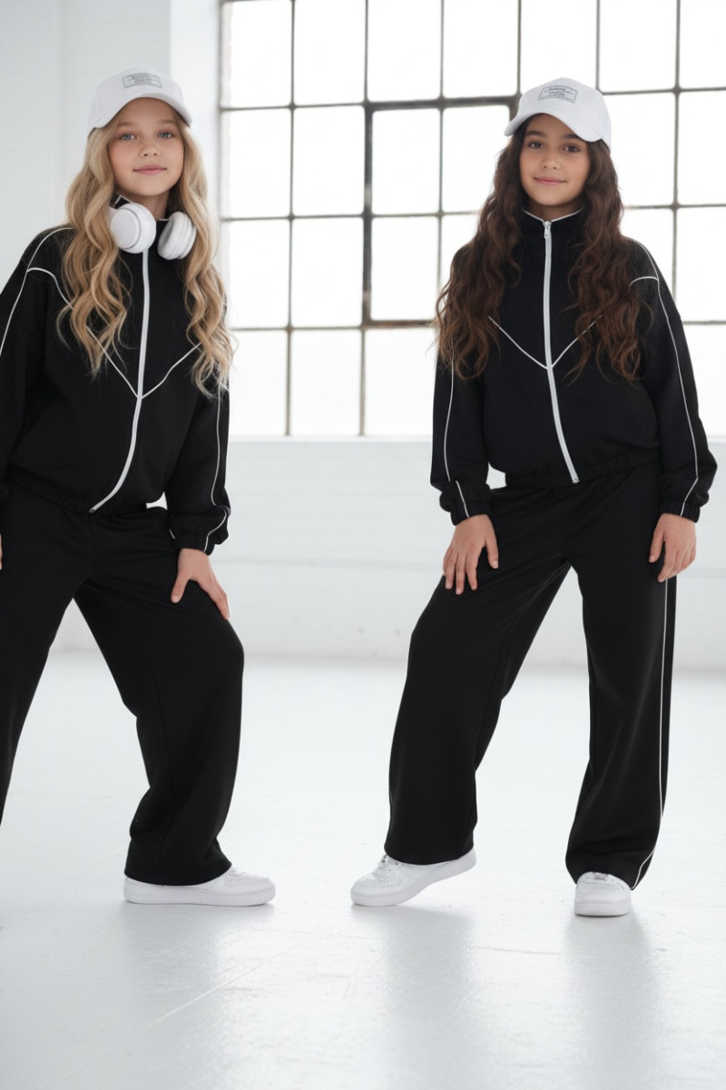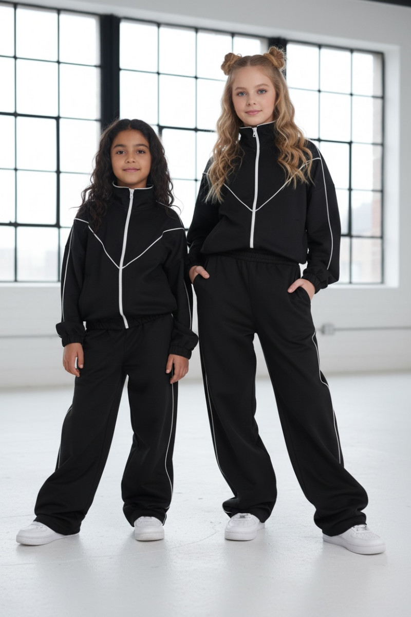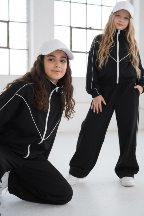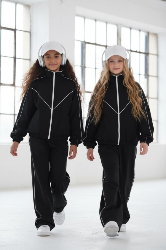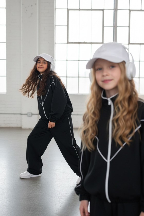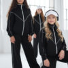 Komplet dresowy premium dla dziewczynki – czarny z kontrastową lamówką, blu.za rozpinana i spodnie.