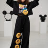 Spodnie zielone szwedy bawełniane o szerokim kroju nogawki, w pasie guma a także dodatkowe wiązanie. Funkcjonalne kieszenie. Na nogawce spodni znajduje się grafika identyczna jak na bluzce, która dodaje im dodatkowego uroku i wyjątkowości.