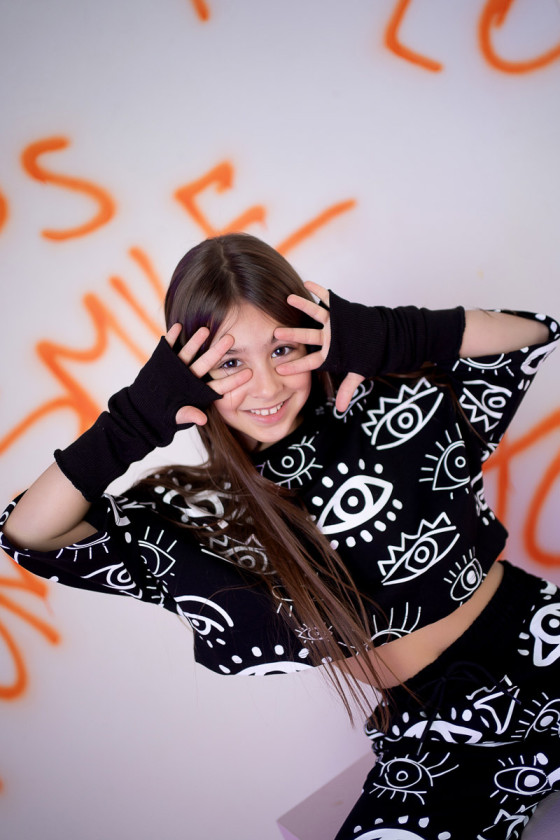 Bluzka bawełniana o szerszym kroju oversize, ozdobiona modnymi grafikami w postaci oczek. Ta wyjątkowa grafika dodaje bluzie unikalnego charakteru. Bluza ma obszerne luźne rękawy, które dodają jej stylowego wyglądu i zapewniają swobodę ruchu.