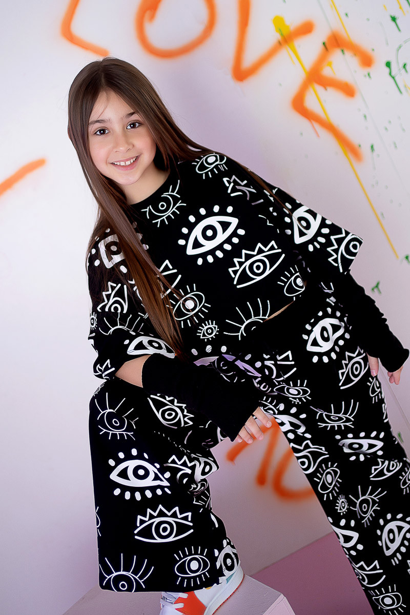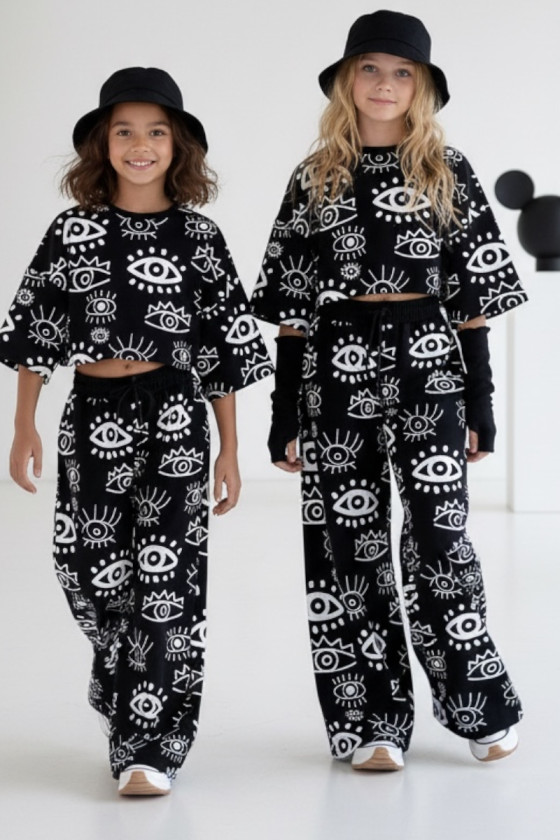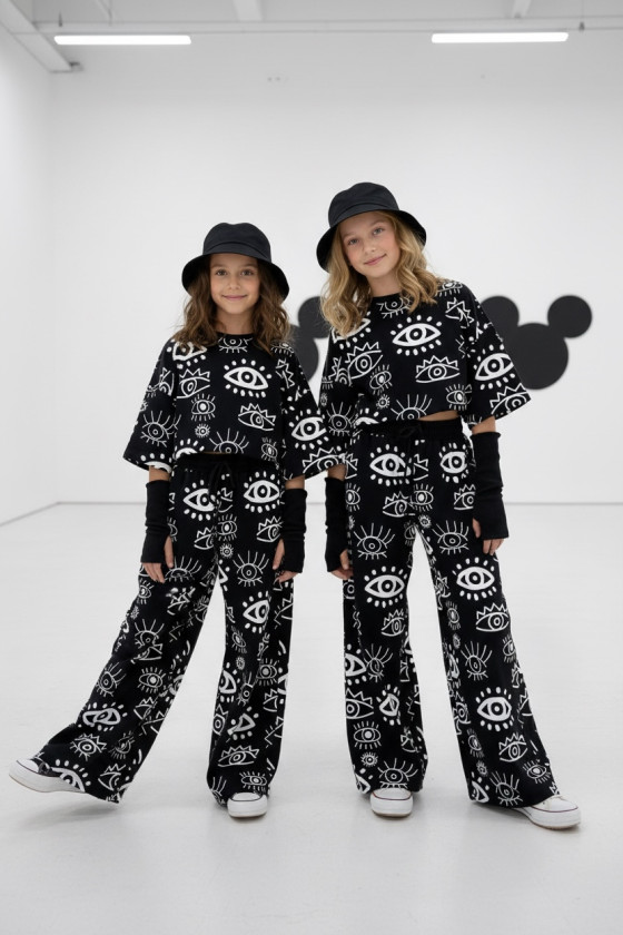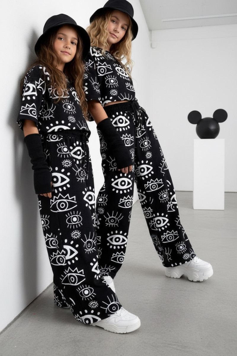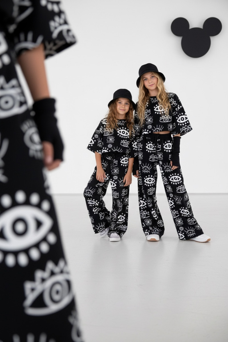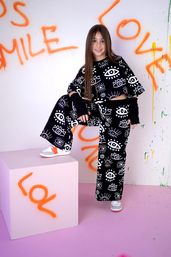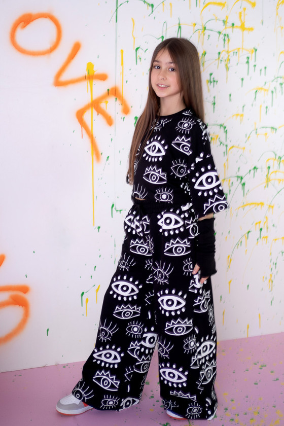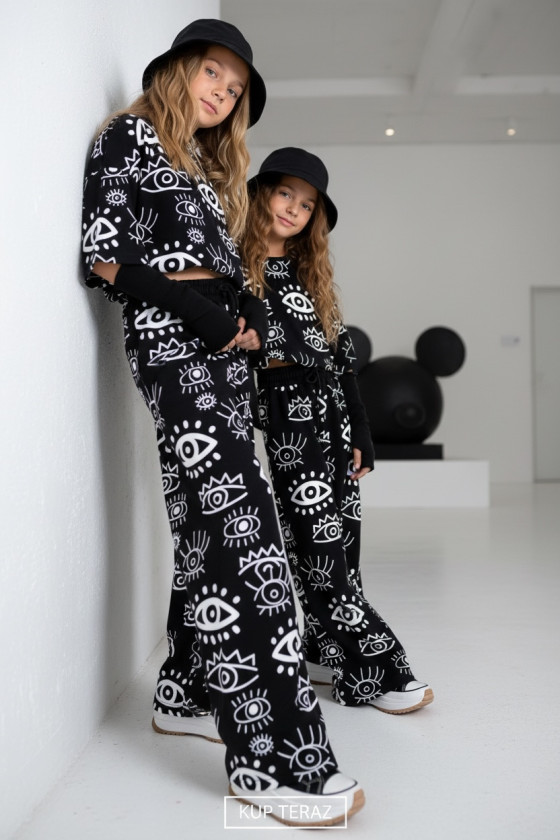 Spodnie szwedy bawełniane o szerokim kroju nogawki, w pasie guma a także dodatkowe wiązanie. Funkcjonalne kieszenie. Na całej powierzchni nogawek spodni znajduje się grafika w postaci oczek, która dodaje im dodatkowego uroku i wyjątkowości.