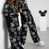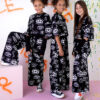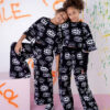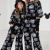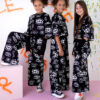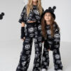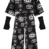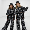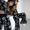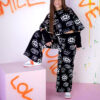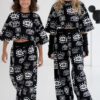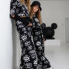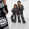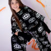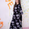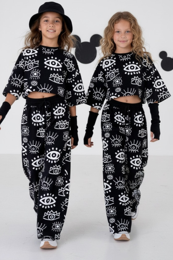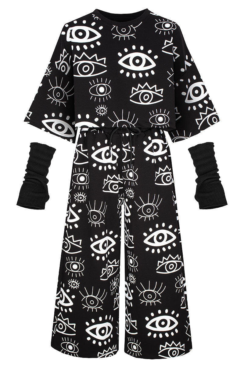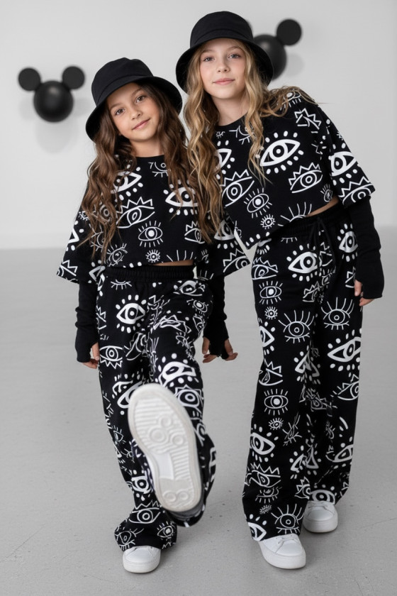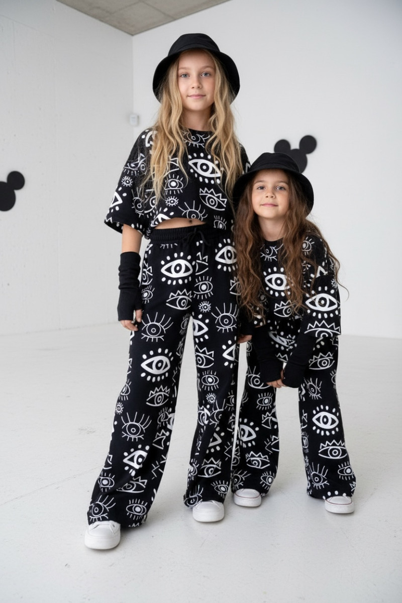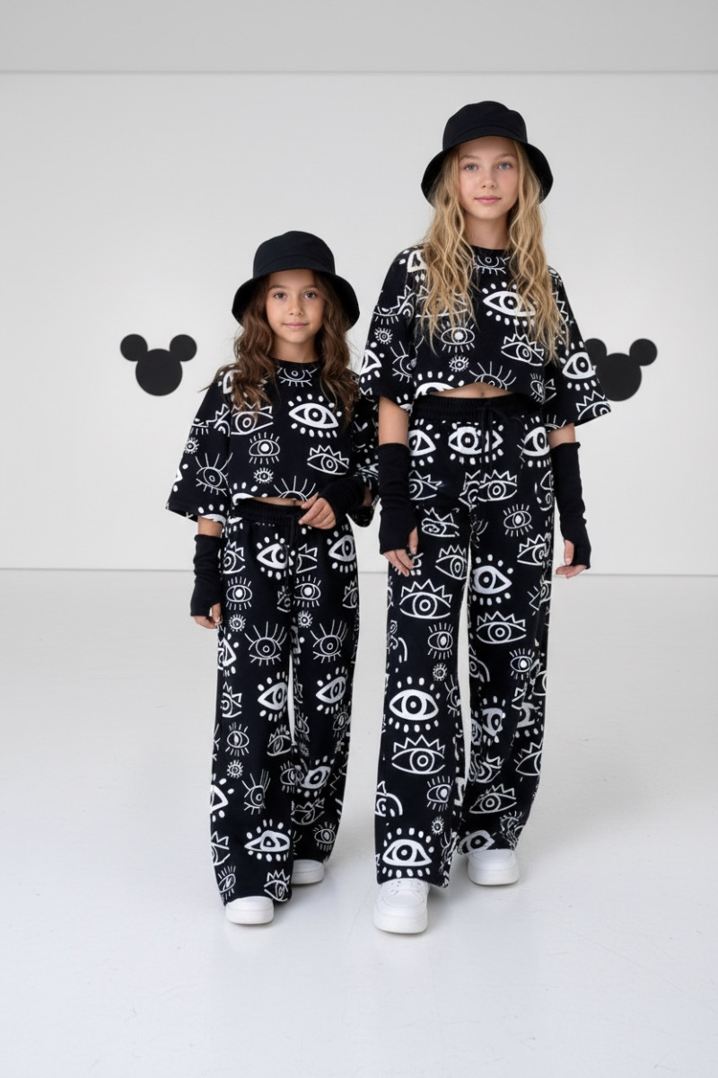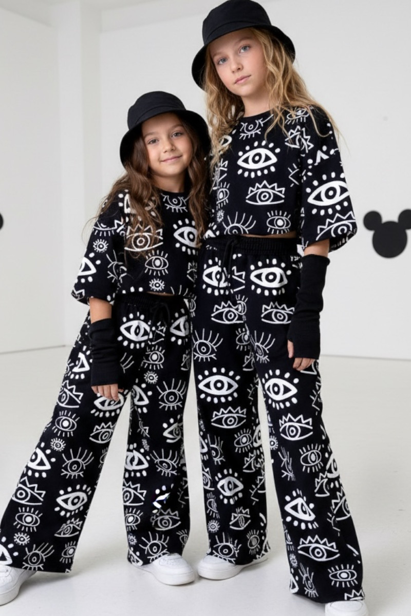 Spodnie szwedy bawełniane o szerokim kroju nogawki, w pasie guma a także dodatkowe wiązanie. Funkcjonalne kieszenie. Na całej powierzchni nogawek spodni znajduje się grafika w postaci oczek, która dodaje im dodatkowego uroku i wyjątkowości.