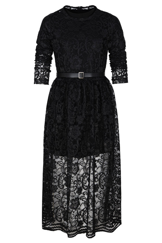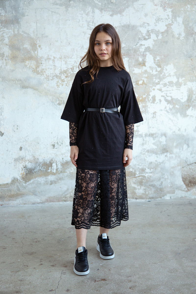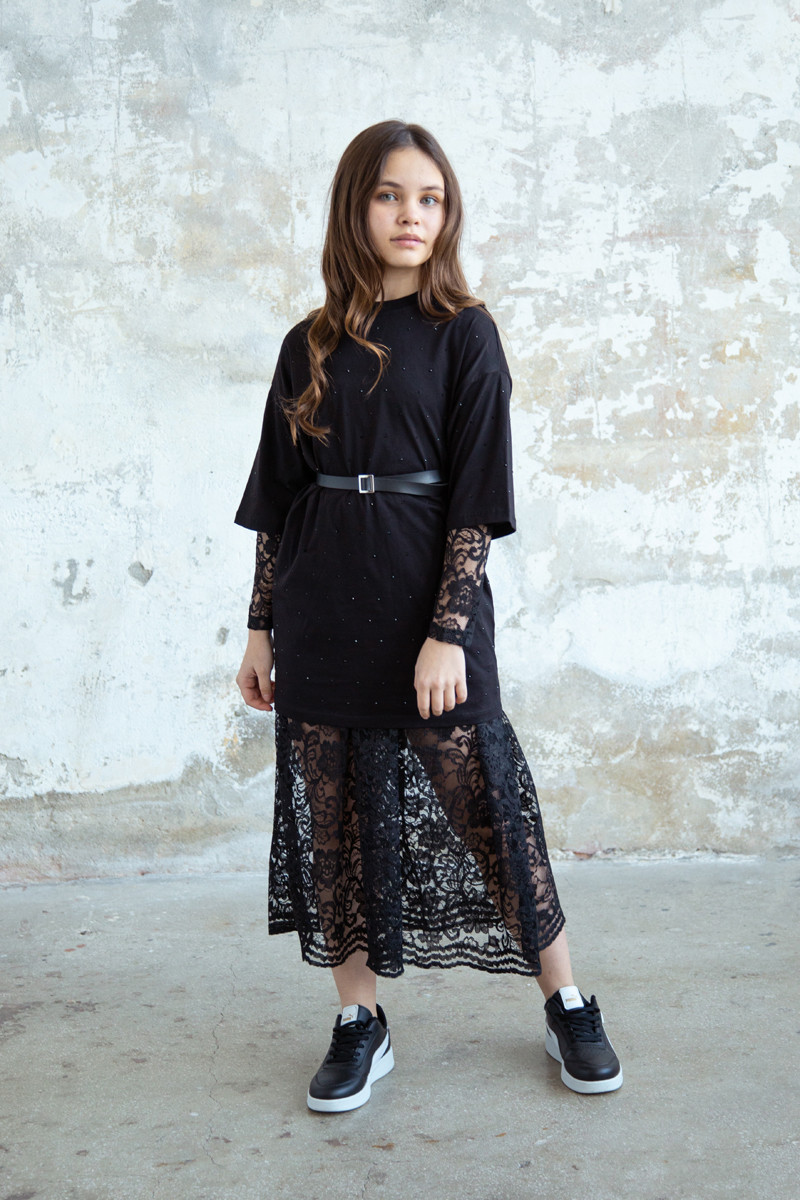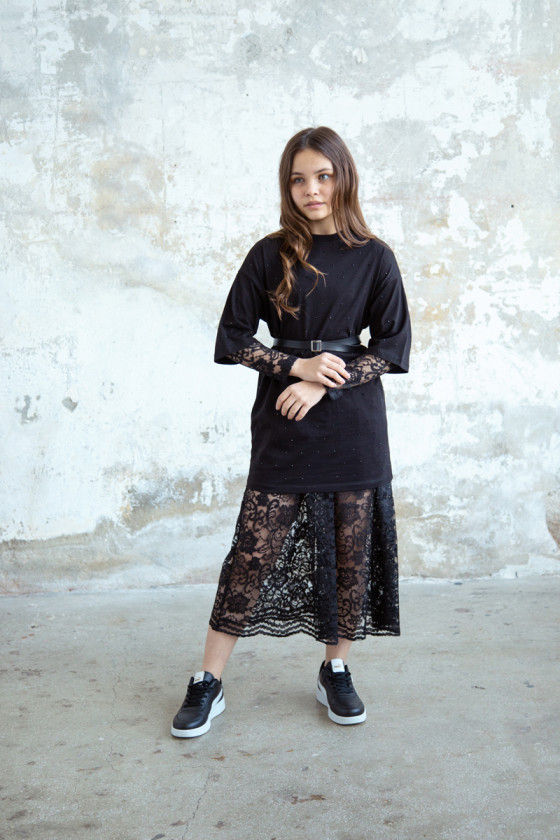1. Sukienka z koronki + na wierzch bawełniana tunika z paskiem – nowoczesny, modny look.